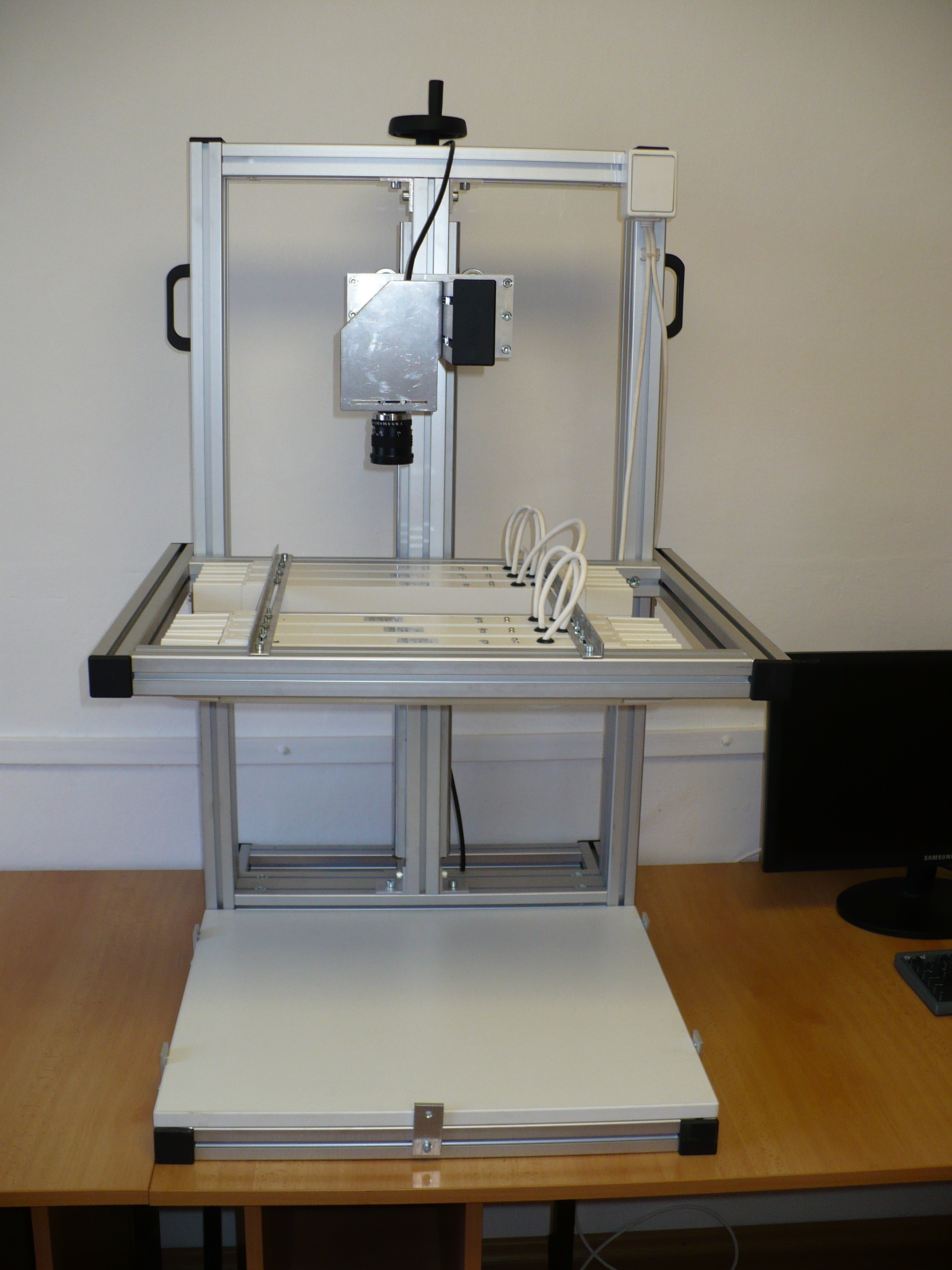 Kamerový systém MiestnosťLaboratorium modernych metód riadenia fyzikálnych systémov V142aSprávca modeludoc. Ing. Ján Jadlovský, CSc., Bc. Tomáš TkáčikVýrobcaKybernetika s.r.o. Stručná charakteristika modelu výukový laboratórny model kamerového systémuvhodný pre štúdium a experimenty súvisiace s rozpoznávaním obrazumožnosť využitia čiernobielej kamery Guppy F-503 alebo farebnej kamery AVT Marlin F-131cpripojenie k PC cez rozhranie Firewiremožnosť nastavenia intenzity osvetlenia ako aj výšku a uhol kamery Mechanické prevedenie Model pozostáva z podstavca, na ktorý sa ukladá snímaný objekt, nastavovateľného rámu s osvetlením a nastaviteľného držiaka kamery.Na držiak kamery sa umiestňuje kamera (čiernobiela alebo farebná), ktorej je možné nastaviť snímanú výšku a uhol.K PC je kamerový systém pripojený cez vysoko rýchlostné rozhranie Firewire, čo umožňuje spracovanie obrazu v reálnom čase.Snímaný obraz je spracovávaný v Matlabe alebo v aplikáciach vytvorených v jazyku C Využitie modelu v pedagogickom procese predmetyDistribuované systémy riadenia (1.ročník Ing. štúdia)riešené bakalárske práce2013PETRO, Miroslav: Návrh a realizácia aplikácie pre rozpoznávanie obrazu v jazyku C# (vedúci ZP: doc. Ing. Ján Jadlovský, CSc.) – 2013VARGA, Michal: Rozpoznávanie obrazu a komunikácia v rámci riadenia robotického futbalu (vedúci ZP: doc. Ing. Ján Jadlovský, CSc.) – 2013riešené diplomové práce2015VARGA, Michal: Spracovanie obrazu za účelom lokalizácie mobilných robotov (vedúci ZP: doc. Ing. Ján Jadlovský, CSc.) – 20152011KAČMÁR, Matej: Aplikácia systému rozpoznávania dynamických obrazov pre výrobné linky (vedúci ZP: doc. Ing. Ján Jadlovský, CSc.) – 2011ŠEPENTAL, Patrik: Aplikácia systému rozpoznávania statických obrazov pre výrobné linky (vedúci ZP: doc. Ing. Ján Jadlovský, CSc.) – 2011 Galéria