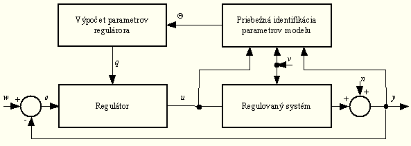 Táto schéma znázorňuje zapojenie uzavretého regulačného obvodu, v ktorom blok "Regulovaný systém" má v tomto prípade dva vstupy, dva výstupy a nemá poruchu v. K tomuto systému je paralelne zapojený blok priebežnej rekurzívnej identifikácie, ktorý v každom kroku riadenia odhaduje parametre riadeného TITO systému a tie zapisuje do bloku "Výpočet parametrov regulátora". Vypočítané parametre regulátora q sa v bloku "Regulátor" použijú na výpočet akčného zásahu, teda výstupu regulátora. To prebieha cyklicky pre každý krok riadenia.