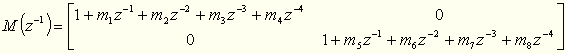 V bloku STC regulátora možno nastaviť parametre matice predpísaných pólov M a to tak, že v hranatých zátvorkách do vstupného poľa vložíte 8 koeficientov ( [m1 m2 ... m8] ). Matica M je v tvare: